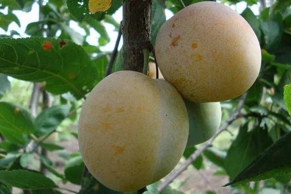 - Созревание – начало августа. Отличается крупными плодами, их вес – 40-50 г. Форма – шарообразная, по бокам плоды немного сплюснуты. Сливы нежно-жёлтой окраски, мякоть ароматная, приятная на вкус. На кожице – лёгкое опушение и восковый налёт. У мякоти ярко выраженный аромат слив.
