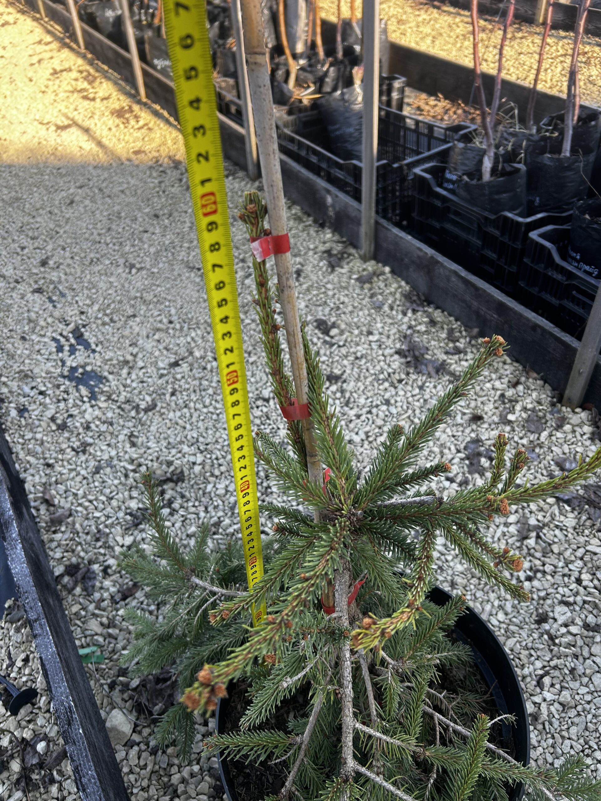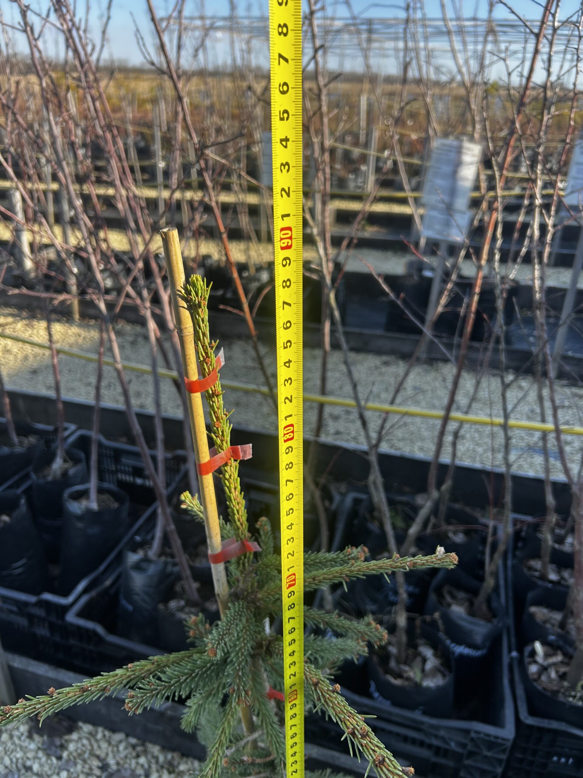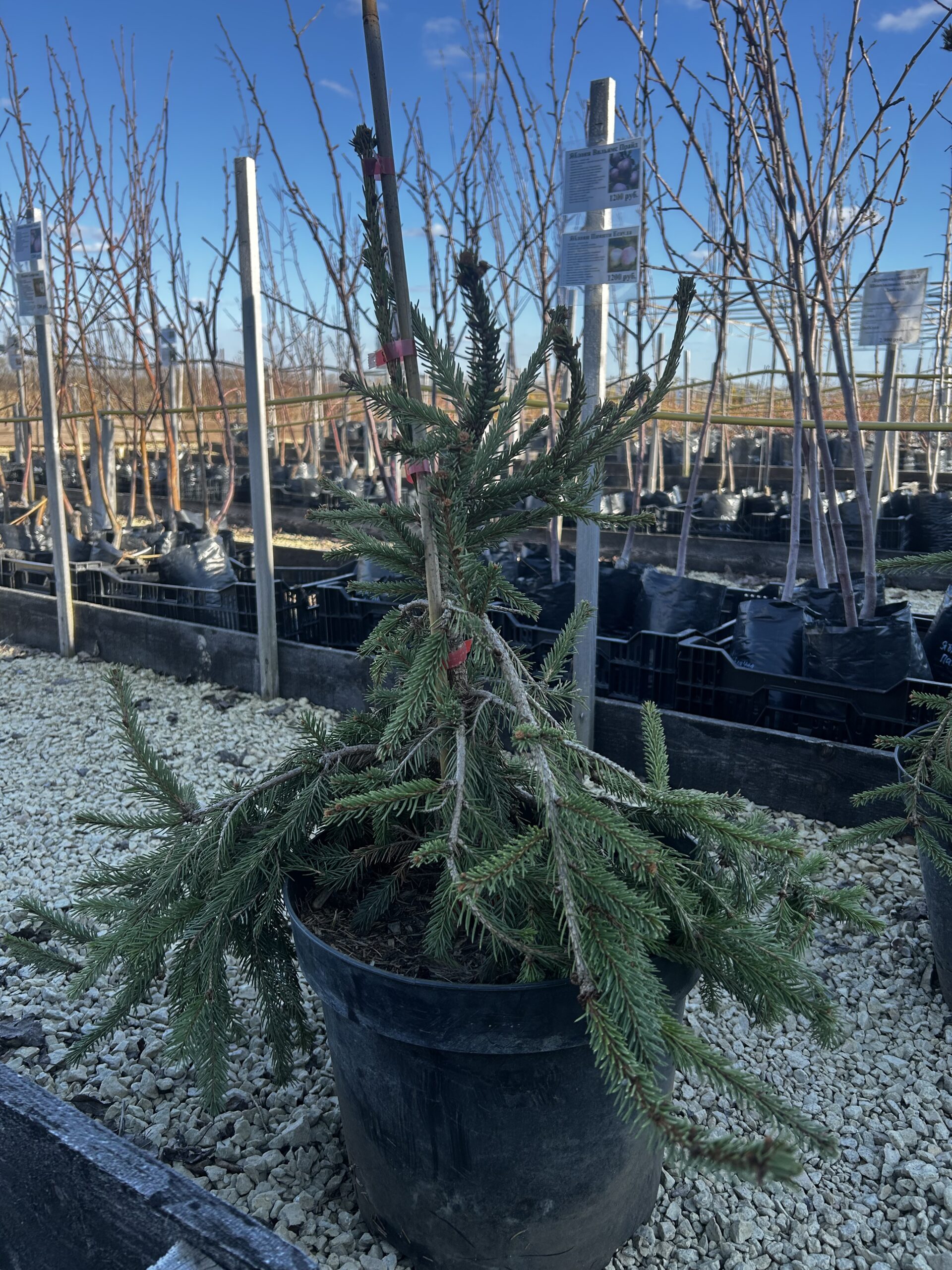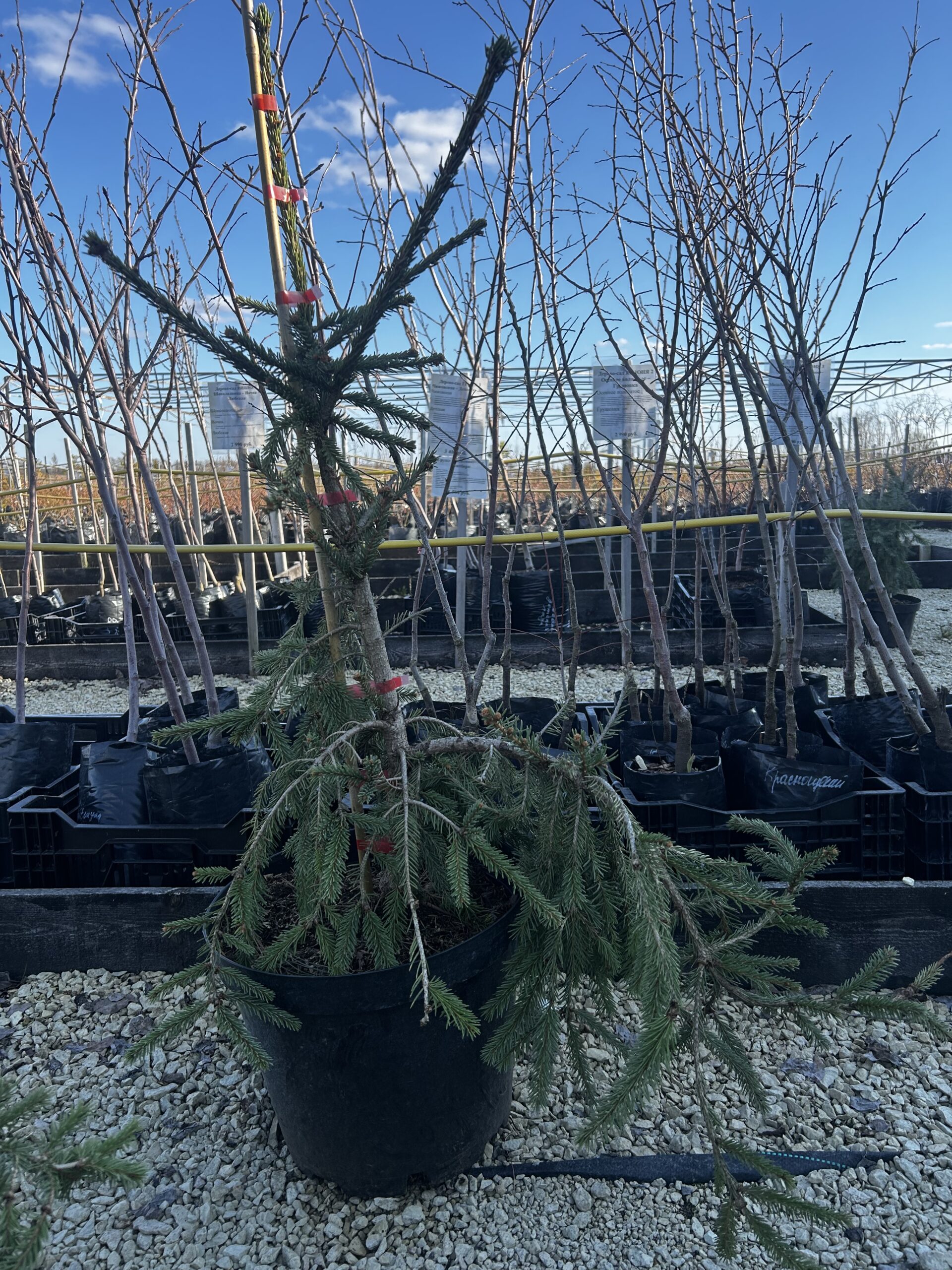 Размер взрослого растения в 25-30 лет зависит от способа ведения кроны — от 3 метров в высоту до 2 в ширину. Размер в 10 лет: невысокая ель, диаметром около метра. Годовой прирост: 20-30 сантиметров. Форма кроны: плакучая.