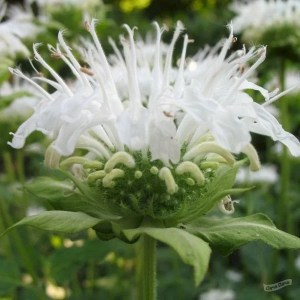 Монарда представляет собой травянистое растение с пышными белыми цветками необычной формы и темно-зелеными листьями.